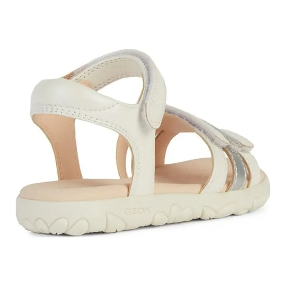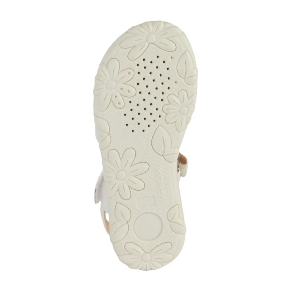 Shop deze stijlvolle Geox sandalen voor meisjes in het wit. Perfect voor kinderen, deze sandalen zijn gemaakt van 100% polyurethaan bovenkant en voering, en 100% thermoplastisch rubberen buitenzool. Productcode: J458ZD 000NF C0459.