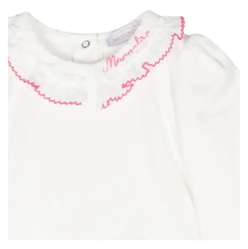 Monnalisa Kids witte body gemaakt van katoenen jersey, lange mouwen, gerimpelde kraag en geborduurd logo in contrasterend fuchsia, sluiting aan de achterkant met drukknopen. Samenstelling: 96% katoen 4% elastaan.