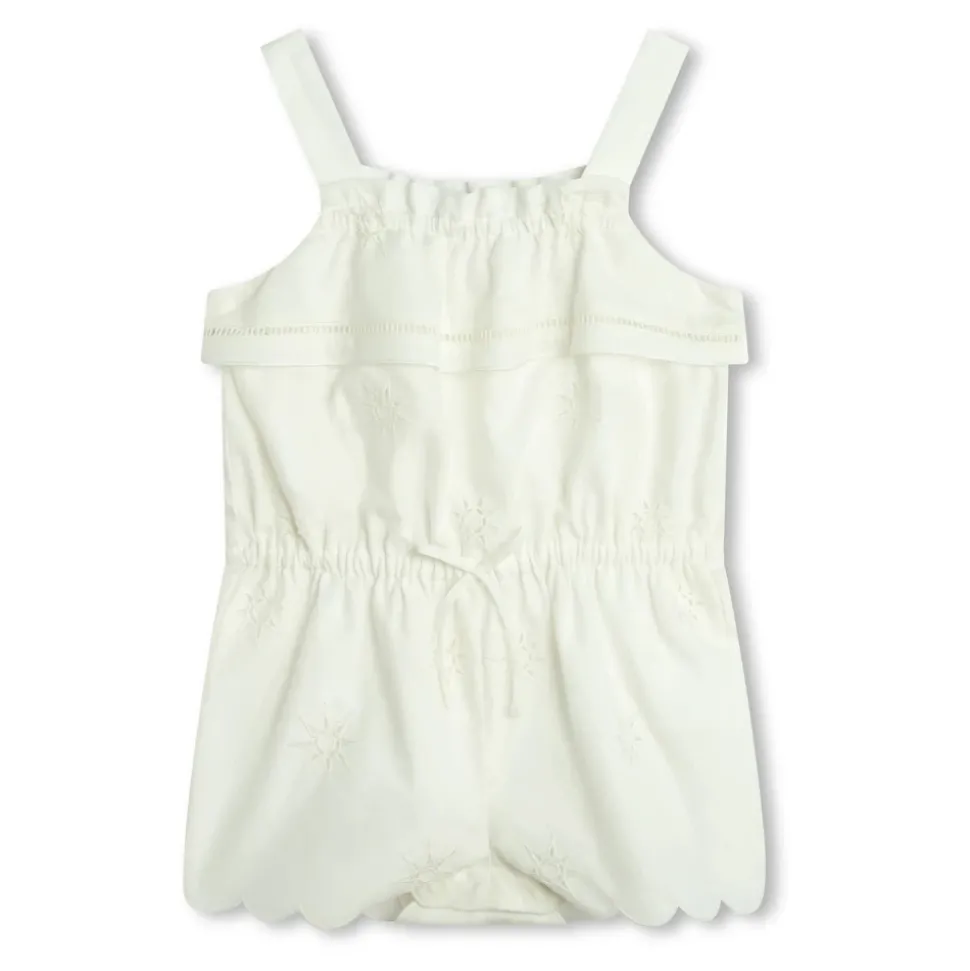 Ontdek de elegantie van deze Chloé witte katoenen romper, ontworpen met ingewikkelde broderie anglaise ruches voor een vleugje verfijning. Perfect voor elke gelegenheid, deze romper combineert moeiteloos stijl en comfort. Belangrijkste kenmerken: Wit | Katoen Poplin | Elastische tailleband | Vierkante hals | Mouwloos ontwerp | Geschulpte zoom | Afmetingen en pasvorm: Normale pasvorm | Samenstelling en onderhoud: 100% Katoen | Machinewas koud, droogtrommel laag