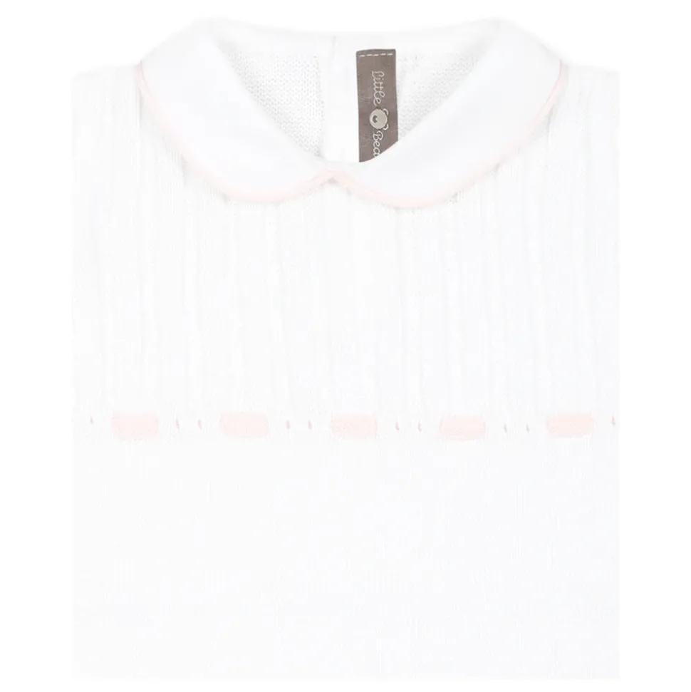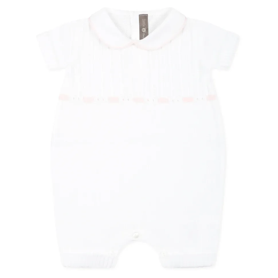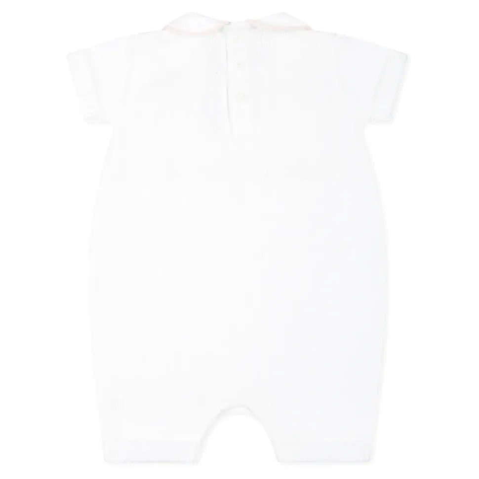 Kleed je kleintje in stijl met deze witte katoenen romper van Little Bear. Met korte mouwen, een katoenen poplin peter pan kraag, sluiting met parelmoerknopen en manchetten aan de mouwen en enkels. Versierd met een roze lintdetail aan de voorkant. Gemaakt in Italië. Materiaal: 100% katoen. Verzorging: Handwas.