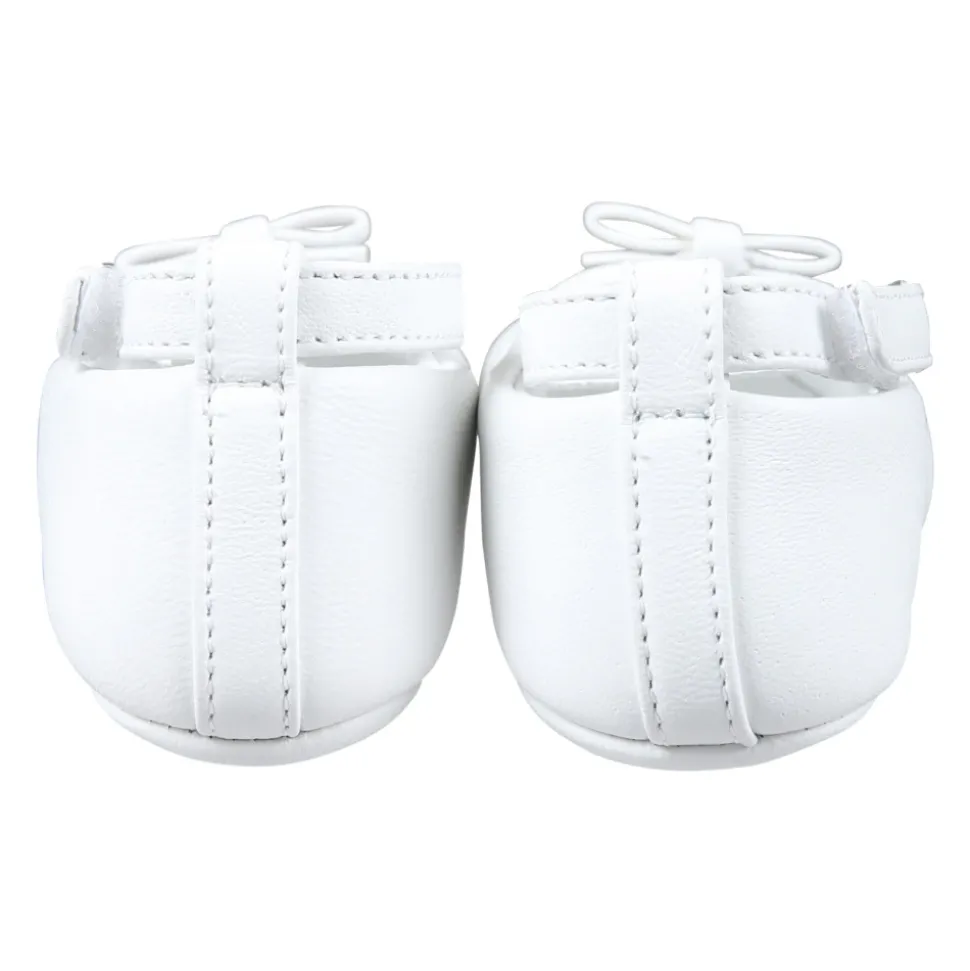 Upgrade de stijl van je kleine meid met deze Dolce & Gabbana witte leren ballerina schoenen. Voorzien van een klittenband, strikversiering en een gouden logo, zijn deze balletflats perfect voor elke gelegenheid. Schoenenzak inbegrepen. Gemaakt van 100% leer.