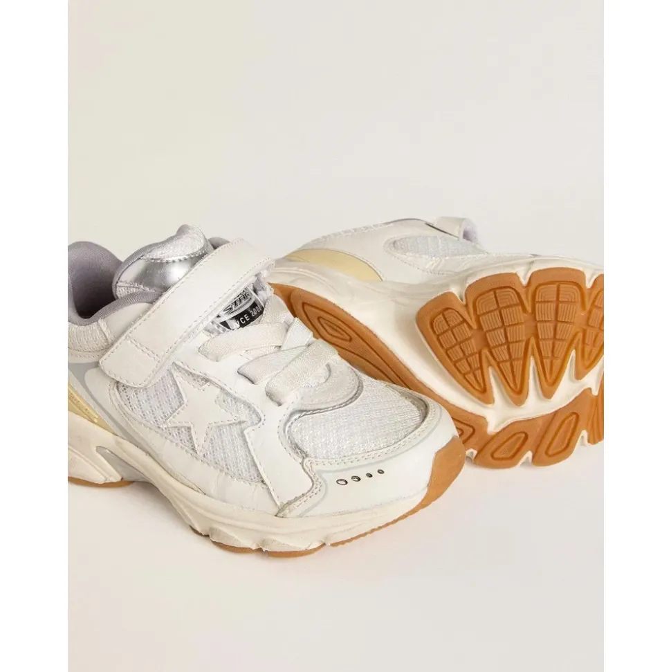Golden Goose Kinderen Witte Leren en Mesh Sneakers voor jongens. Met wit leren ster, zilver gelamineerde leren hiel, TPU inzetstukken, lived-in behandeling, platte witte veters, ‘Lightstar’ binnenzool en tonglabel. Gemaakt van 49% LH, 42% PL, 9% PU stof.