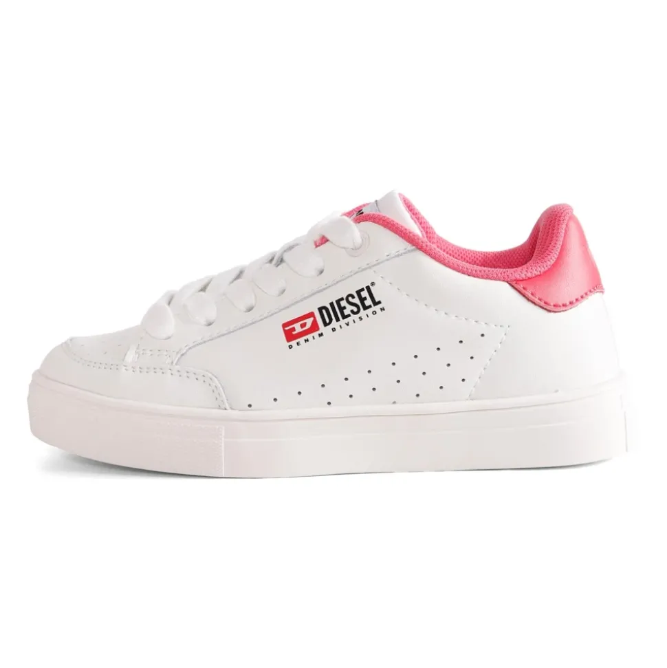 Upgrade de stijl van je kind met deze Diesel witte leren sneakers. Voorzien van een rubberen zool, veters, ronde neus en een roze detail op de hiel, zijn deze sneakers versierd met een zijlogo. Gemaakt van 100% leer.