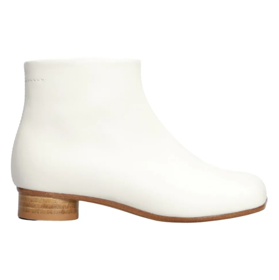 Verhoog je stijl met deze Maison Margiela witte leren laarzen, met een kenmerkende vierkante neus en brede hak voor een chique look. Belangrijkste kenmerken: Wit | Leer | Zijdelingse ritssluiting | Vierkante neus | Brede hak | Leren zool | Samenstelling en onderhoud: Leer | Niet gespecificeerd