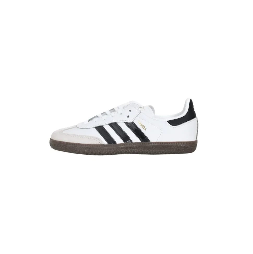 ADIDAS ORIGINALS Samba OG witte sneakers voor jongens en meisjes. De adidas Samba OG schoenen voor kinderen zijn een ware klassieker. Met een zachte leren bovenkant en de iconische suède T-teen, is de Samba OG al sinds de jaren 50 populair. Van voetbalvelden tot skateparken heeft deze schoen onderweg een legioen fans verzameld. Met een rubberen zool en gemakkelijk te dragen kleuren en materialen, hebben deze schoenen een tijdloze maar moderne uitstraling. De glanzende lakleren 3 strepen geven ze een unieke afwerking. Herfst winter seizoen. Lage profiel witte sneakers voor kinderen. Materiaal: Leer en rubber.