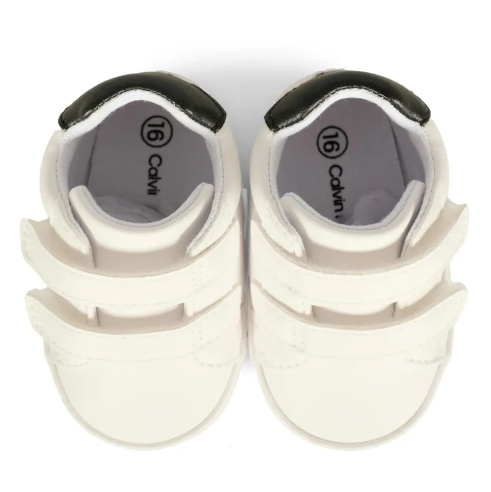 Upgrade de stijl van je kind met deze Calvin Klein witte sneakers van imitatieleer met klittenbandsluiting, zwarte detail aan de achterkant en een zwart zijlogo. Gemaakt met minstens 50% katoen. 100% synthetisch materiaal.