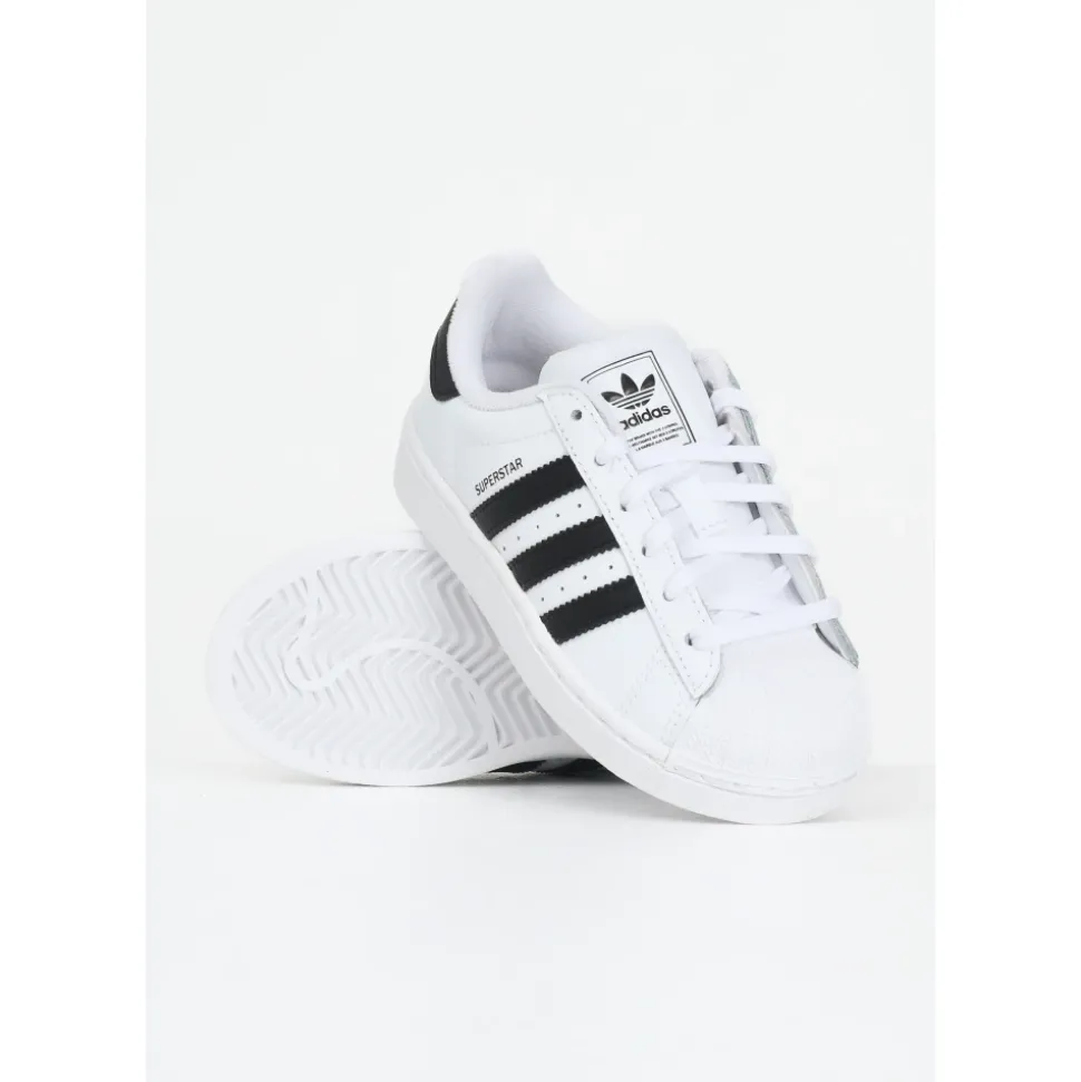 ADIDAS ORIGINALS Superstar II witte sneakers voor jongens en meisjes. De iconische details van deze adidas Superstar voor kinderen blijven de tand des tijds doorstaan. Trouw aan het oorspronkelijke ontwerp uit de jaren ’70, vallen deze veelzijdige sneakers nog steeds op met de onmiskenbare rubberen neus en de gekartelde 3 strepen. Al meer dan 50 jaar zijn adidas Superstar overgegaan van het veld naar de straat en zijn ze nu klaar om het stokje door te geven aan de volgende generatie iconen. Herfst winter seizoen. Leren en rubberen sneakers voor kinderen met laag profiel. Stijl JH9980.