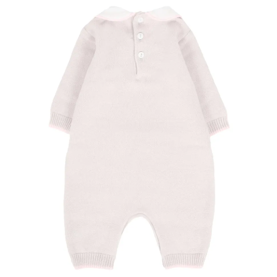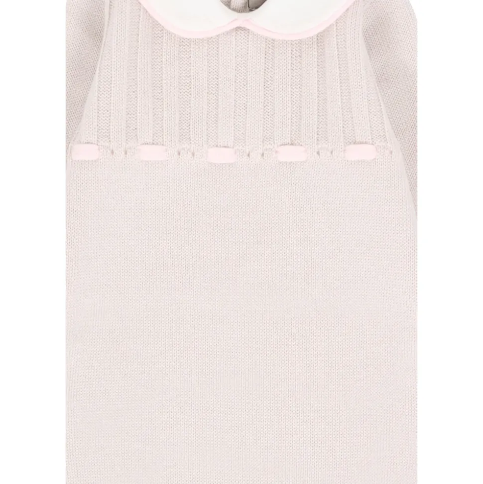 Kleed je kleintje in stijl met deze beige wollen jumpsuit van Little Bear. Met lange mouwen, een katoenen poplin Peter Pan kraag, moeder-of-pearl knoopsluiting aan de achterkant en tussen de benen, en versierd met een roze lint aan de voorkant. Gemaakt in Italië van 100% zuivere wol. Wasinstructies: Wassen op 30°C.