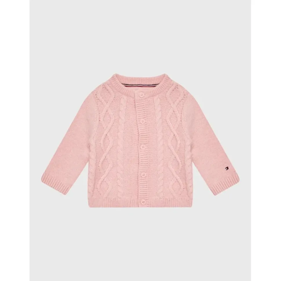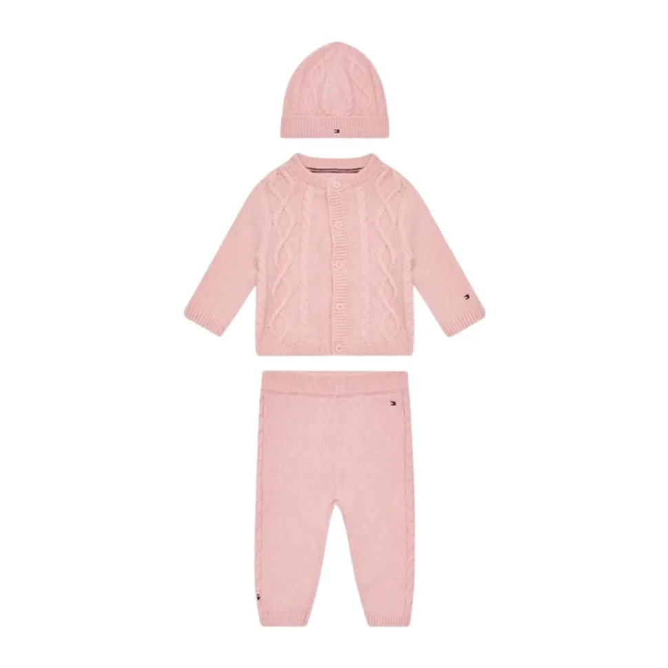 Tommy Hilfiger Kids Set: Gebreide cardigan met vlechtdesign en knoopsluiting met logoborduursel op de mouw. Bijpassende gebreide muts met geborduurd logo. Effen gebreide broek met gevlochten zijband en borduursel onder de elastische tailleband. Geribde manchetten, zoom en tailleband. Ideaal voor winterkleding. WASSEN OP 30° IN DE WASMACHINE – NIET STRIJKEN – NIET WASSEN MET LICHTGEKLEURDE KLEDING – NIET BLEKEN. Gemaakt in China. Samenstelling: 60% katoen, 30% polyamide, 10% wol.