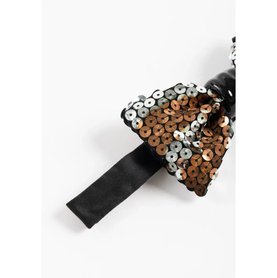 Maak elke formele gelegenheid bijzonder met deze prachtige zijden vlinderdas, voorzien van een opvallende keramische knoop voor een vleugje verfijning. Perfect om een vleugje elegantie toe te voegen aan elke outfit. Belangrijkste kenmerken: Multicolor | Zijde | Verstelbare band | Clip- en haaksluiting | All-over pailletten | Contrasterende keramische knoop | Afmetingen en pasvorm: Verstelbare pasvorm | Samenstelling en onderhoud: 100% Zijde | Alleen chemisch reinigen