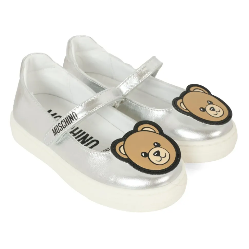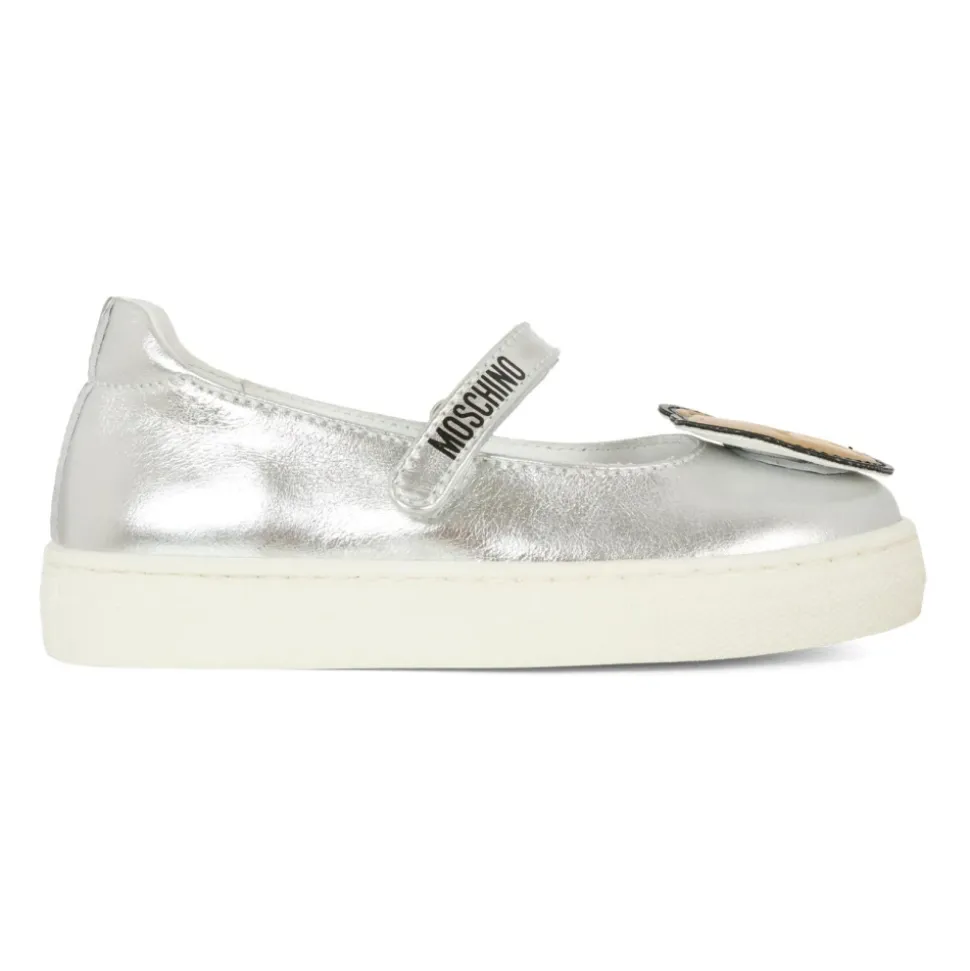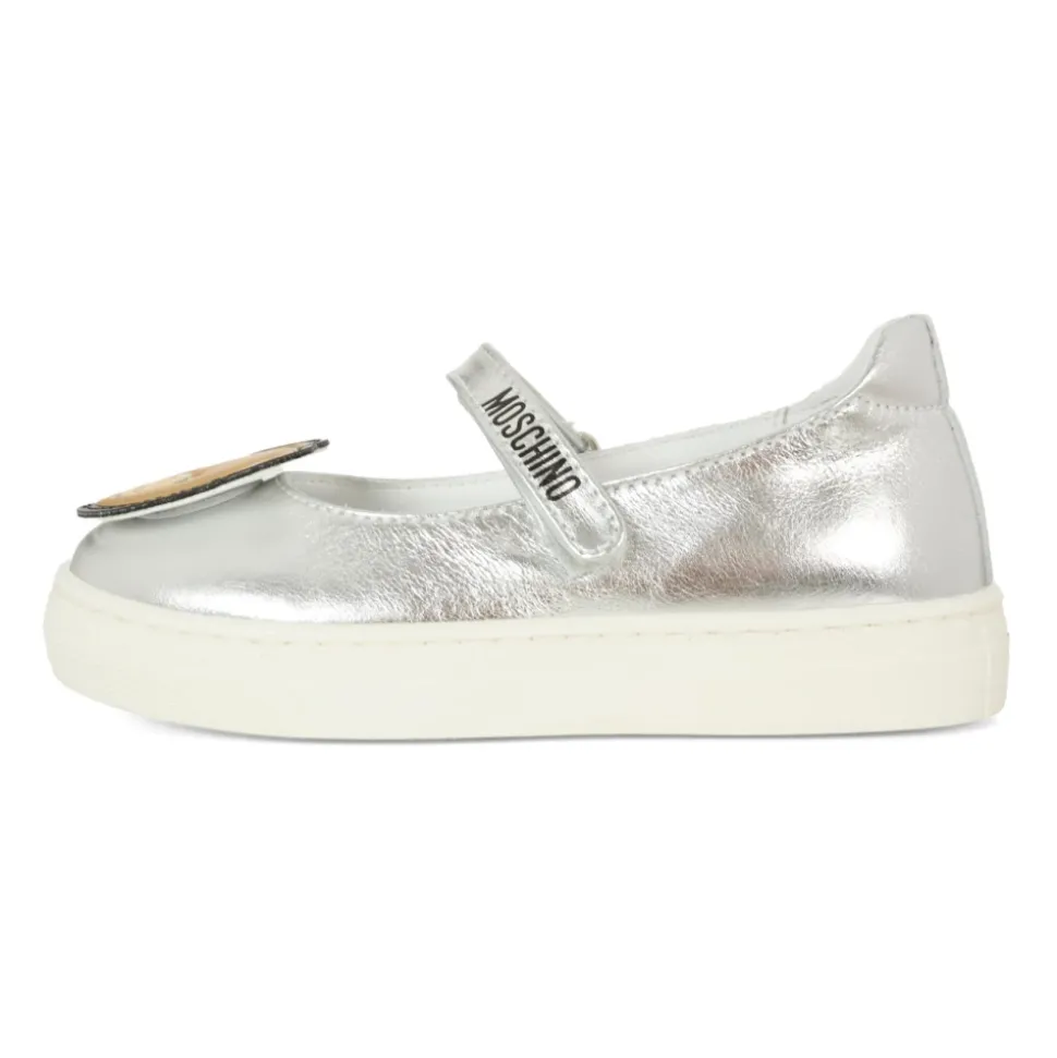 Verrijk de stijl van je kleine meisje met deze Moschino metallic zilveren leren ballerina’s. Gemaakt in Italië, deze ballerina’s hebben een witte rubberen zool, klittenbandsluiting, ronde neus en zijn versierd met een Teddy Bear-vormige patch aan de voorkant en een logo aan de zijkant. Gemaakt van 100% leer.