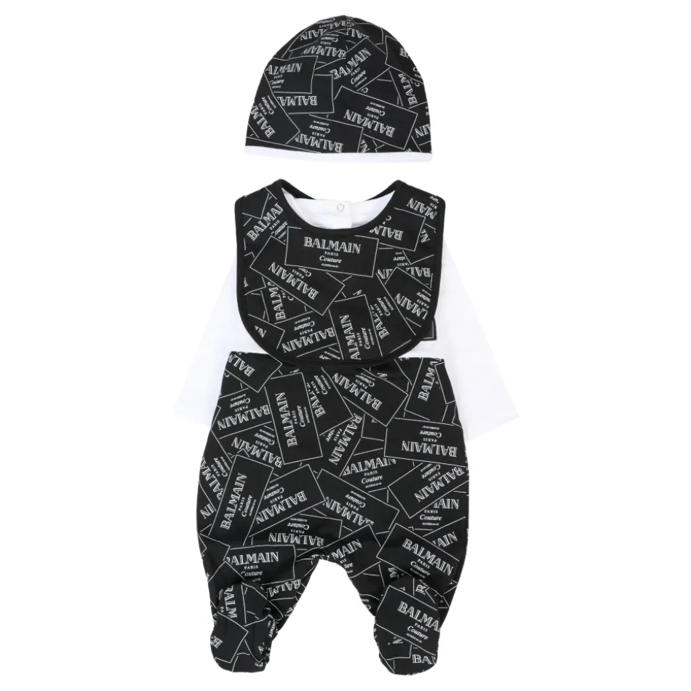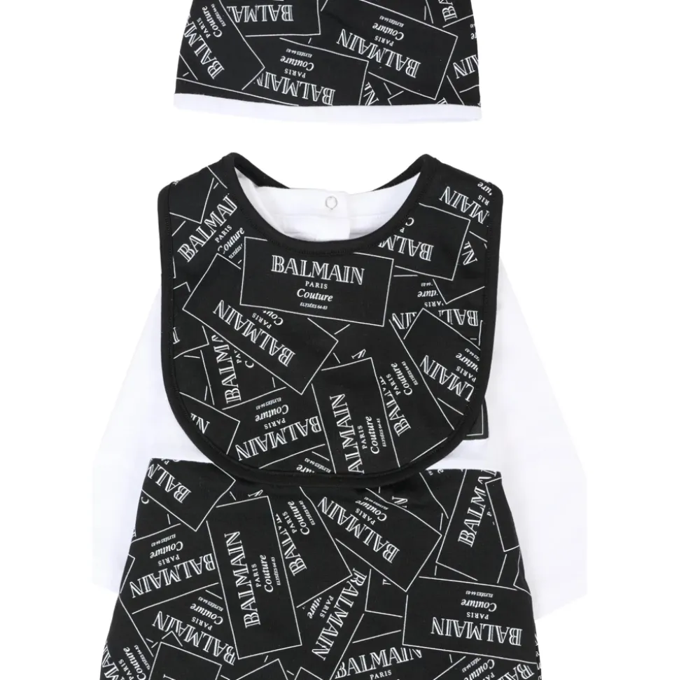 Kleed je kleintje in stijl met deze zwarte katoenen babyset van Balmain. De set bevat een romper met lange mouwen, een muts met contrasterende witte rand en een slabbertje, allemaal versierd met kenmerkende details van Balmain. Gemaakt van 100% katoen, is deze set zowel comfortabel als chique. Machinewasbaar op 30°C.