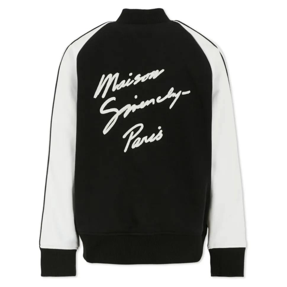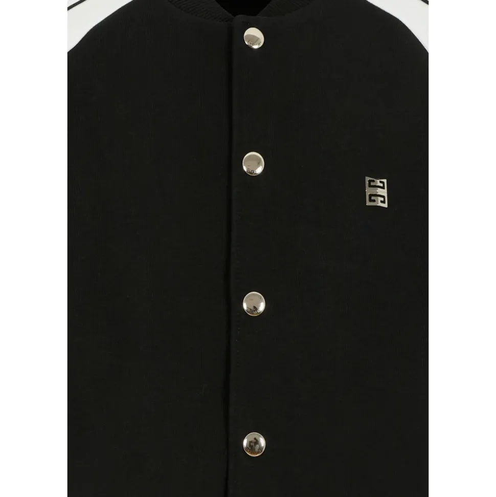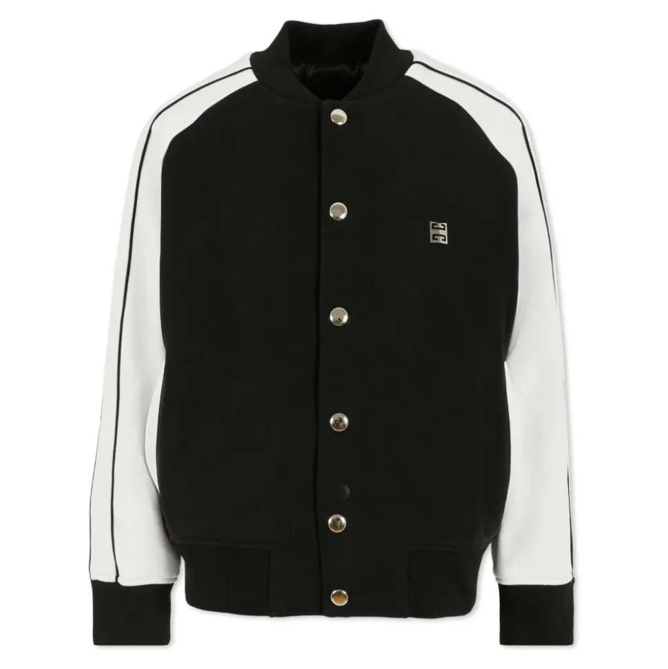 Kleed je kleintje in stijl met deze zwarte bomberjack van Givenchy Kids. Gemaakt van lichtgewicht stof, het heeft lange contrasterende witte mouwen, een lage geribbelde kraag, een voorsluiting met drukknopen, zijzakken en geribde manchetten en zoom. Versierd met het iconische 4G metalen motief op de borst en de Maison Givenchy Paris handtekening geborduurd op de achterkant. Gemaakt van 85% katoen en 15% polyester. Machinewas op 30°C.