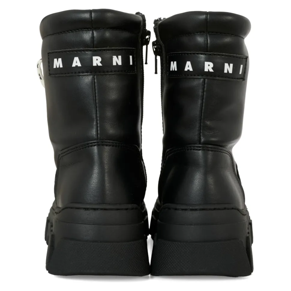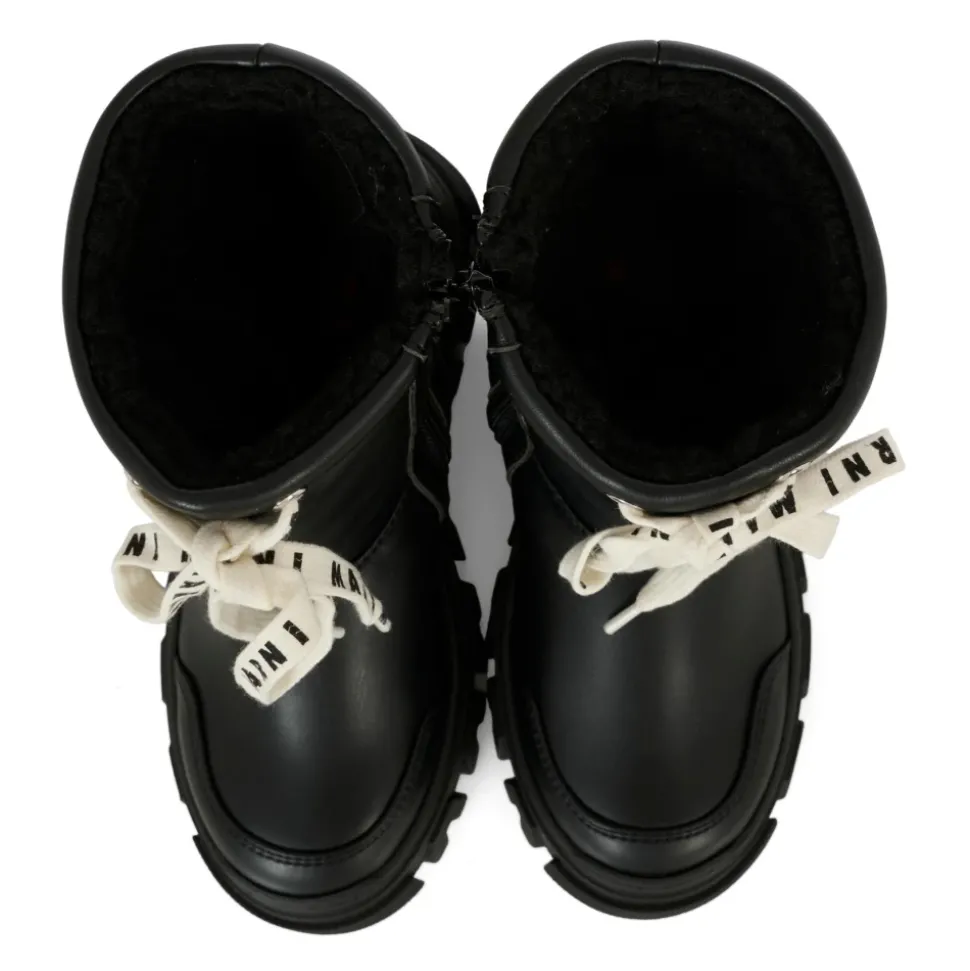 Upgrade de stijl van je kind met deze zwarte eco-leren enkellaarsjes van Marni. Gemaakt in Italië, deze laarsjes hebben een rubberen zool, zijrits, logo veters en een zachte eco-shearling voering. De achterkant is versierd met een logo. Vervaardigd uit 100% synthetische materialen.