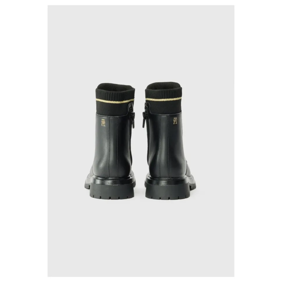 Ontdek de Tommy Hilfiger meisjeslaarzen, perfect voor herfst-winter, ideaal voor gedurfde looks met hun stevige ontwerp en elastische enkel sok. Gemaakt van synthetisch materiaal met een leren effect, klassieke zwarte kleur met gouden contrasterende details en een metalen Tommy Hilfiger logo aan de zijkant. Voorveters, praktische zijrits en antislip profielzool voor een veilige en comfortabele pasvorm. Ideaal voor school, wandelingen of informele gelegenheden met stijl. Samenstelling: synthetisch bovenwerk, stoffen voering, rubberen zool. Reinigen met een vochtige doek, vermijd wasmachine om de kwaliteit van het materiaal te behouden.