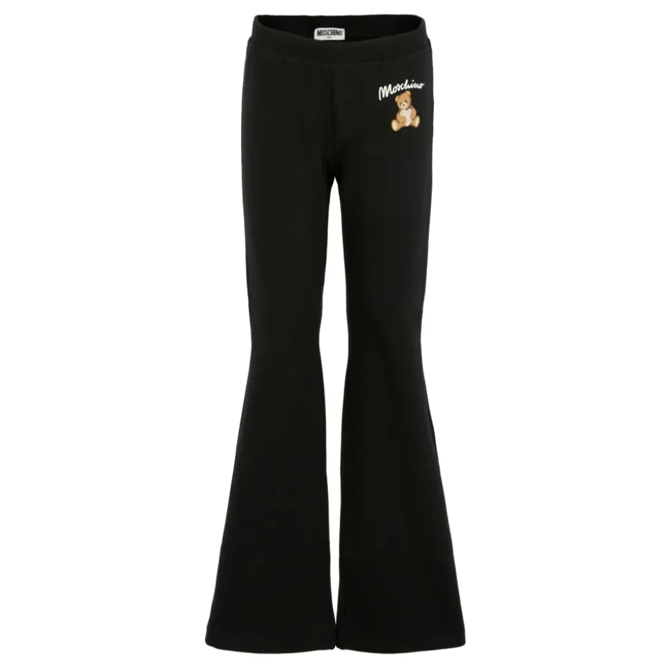 Kleed je kleine meid in stijl met deze zwarte flared leggings van Moschino Kids. Gemaakt van een gezellige fleece katoenmix, hebben deze leggings een elastische taille en zijn versierd met een schattig Teddy Bear ontwerp aan de voorkant. Gemaakt van 95% katoen en 5% elastaan. Machinewas op 30°C.
