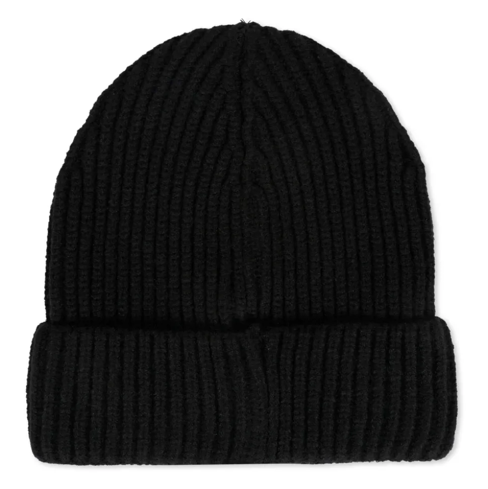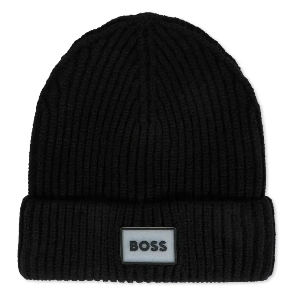Voeg een vleugje stijl toe aan de outfit van je kind met deze zwarte geribbelde gebreide muts van Hugo. Met een omslag en een rubberen patch aan de voorkant, is deze muts gemaakt van 30% viscose, 30% polyester, 22% acryl en 18% polyamide. Makkelijk te onderhouden, gewoon wassen in de machine op 30°C.