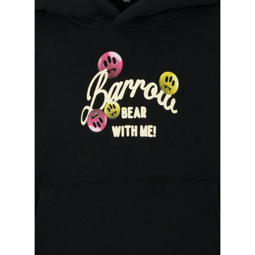 Upgrade de stijl van je kind met deze zwarte sweatshirt van pluche katoen van BARROW. Met lange mouwen, capuchon, geribbelde zoom en manchetten en een zak aan de voorkant. Versierd met een logo en iconische smiley aan de voorkant, gekleurd beerenprint en logo op de achterkant. Wordt geleverd met een logo sleutelhanger in het geel. Gemaakt van 100% katoen. Machinewasbaar op 30°C.