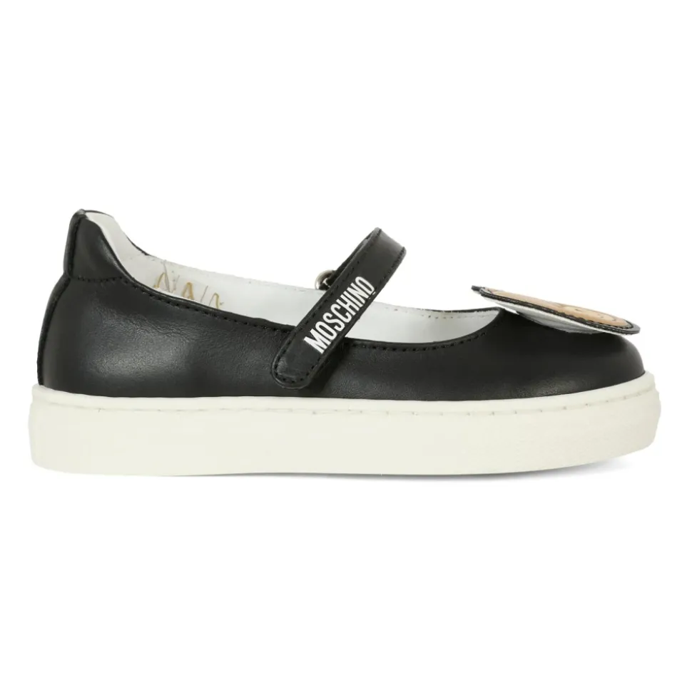 Verwen de stijl van je kleine meid met deze zwarte leren balletflats van Moschino. Met een witte rubberen zool, klittenbandsluiting en een schattige Teddy Bear-patch op de voorkant zijn deze in Italië gemaakte schoenen zowel stijlvol als comfortabel. Perfect voor elke jonge fashionista!