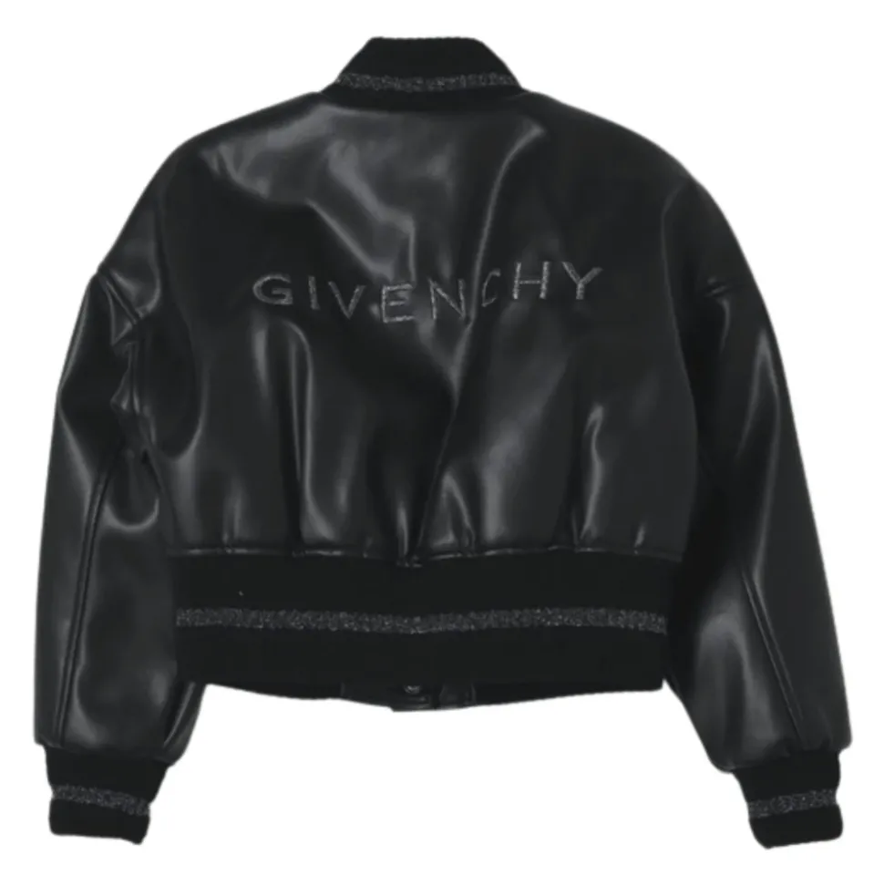 Geef je stijl een boost met deze Givenchy zwarte leren bomberjack, met een chique cropped design en kenmerkende zilveren accenten. Belangrijkste kenmerken: Zwart | Imitatieleer | Cropped design | Bomberkraag | Geribbelde zoom en manchetten met zilveren lurex inzetstukken | Rechte zoom | Twee zijzakken | Zilveren metalen `4G` plaat op de borst | Geborduurde zilveren lurex `Givenchy` letters op de achterkant | Afmetingen en pasvorm: Normale pasvorm | Samenstelling en onderhoud: 55% Polyurethaan | 45% Polyester