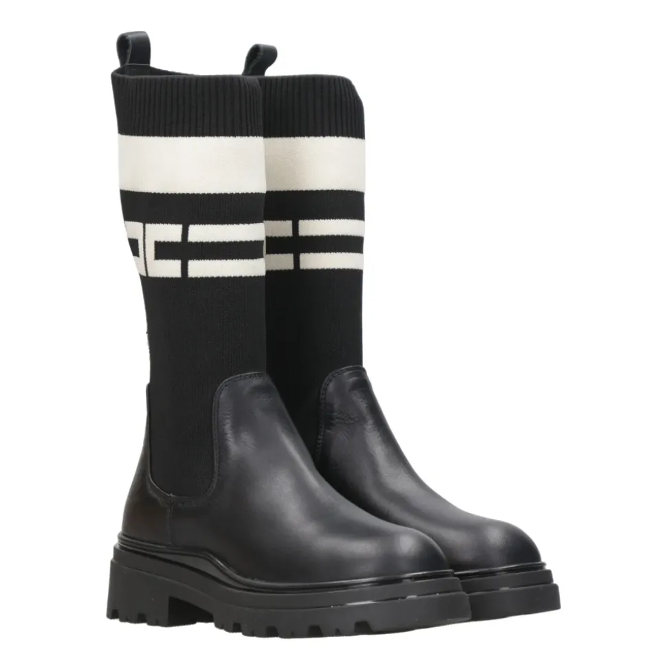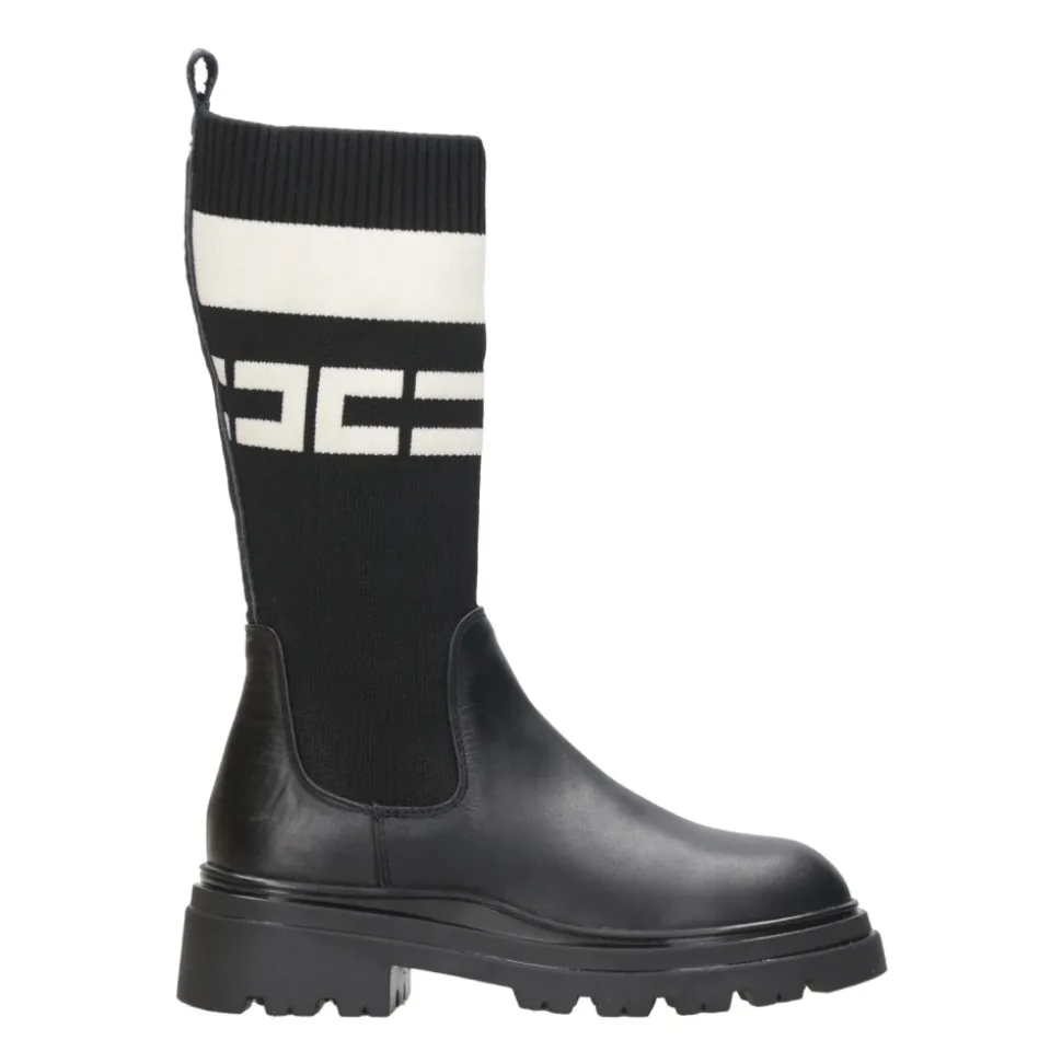 Verrijk de stijl van je kleine meid met deze Elisabetta Franchi leren laarzen. Met een onder-de-knie hoge legging model van stretch gebreide stof en logo detail, geribbelde afwerking, logo-gegraveerde leren trekker, ronde neus en rubberen profielzool.