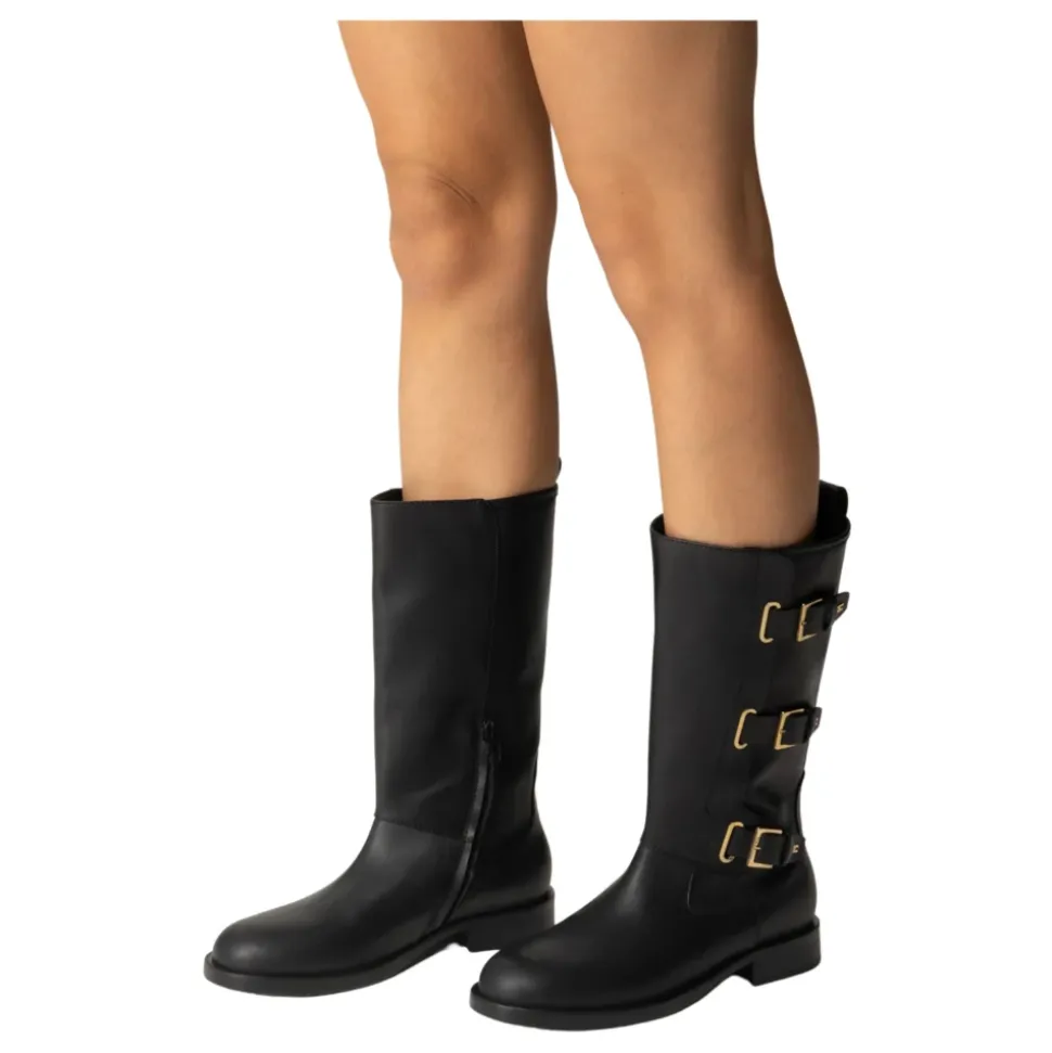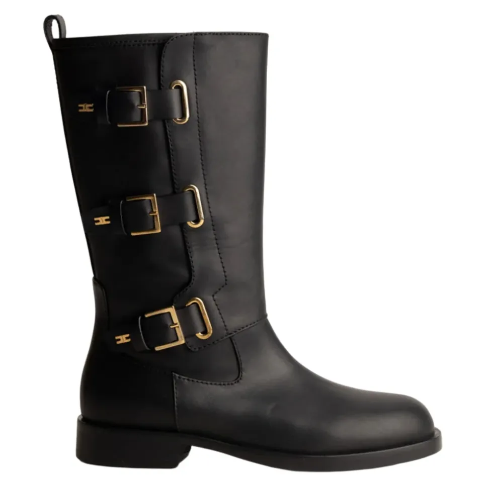 Verhoog de stijl met Elisabetta Franchi`s zwarte leren laarzen, met een strak paneeldesign en praktische zijrits. Belangrijkste kenmerken: Zwart | Leer | Zijrits | Hiel lipje | Paneeldesign | Decoratieve gespdetails | Gouden logo plaatje | Ronde neus | Platte kniehoge zool |