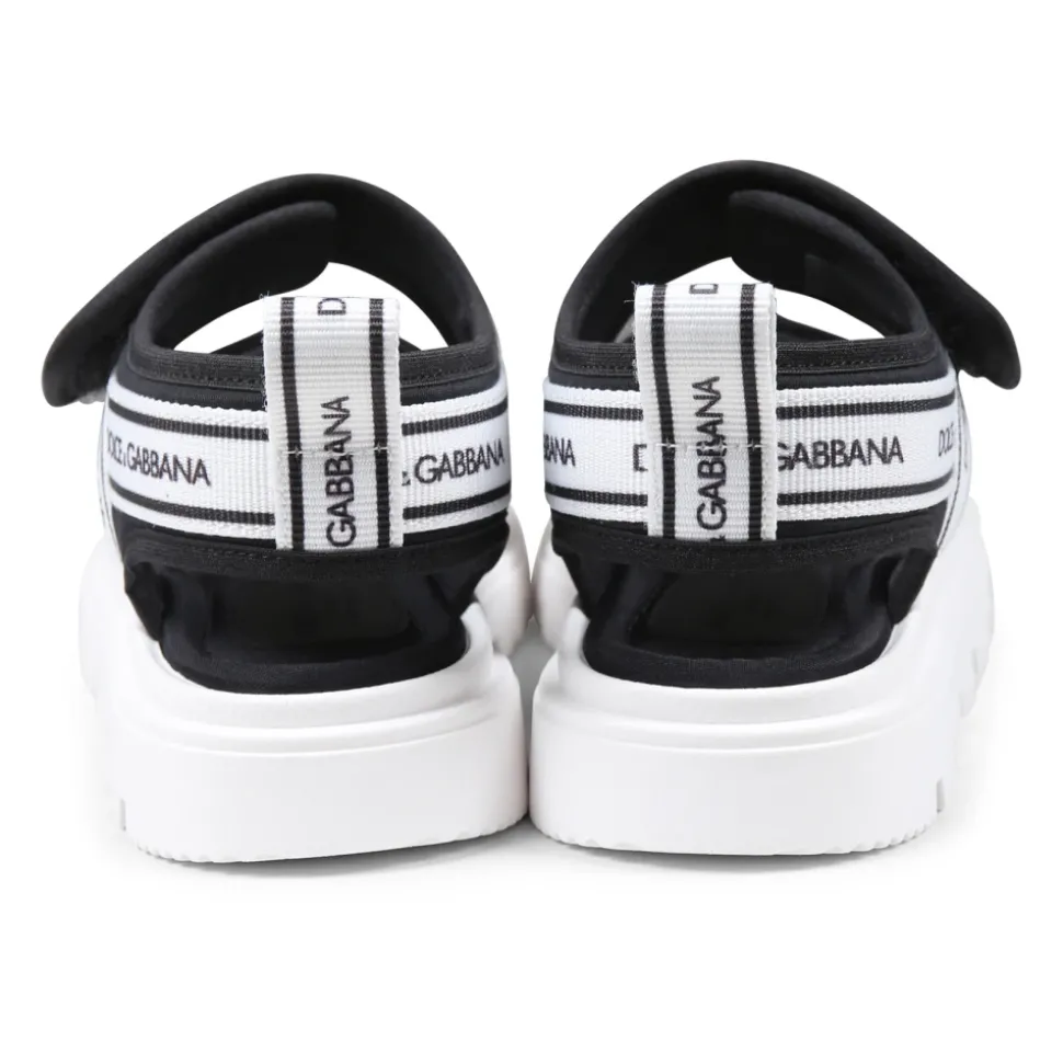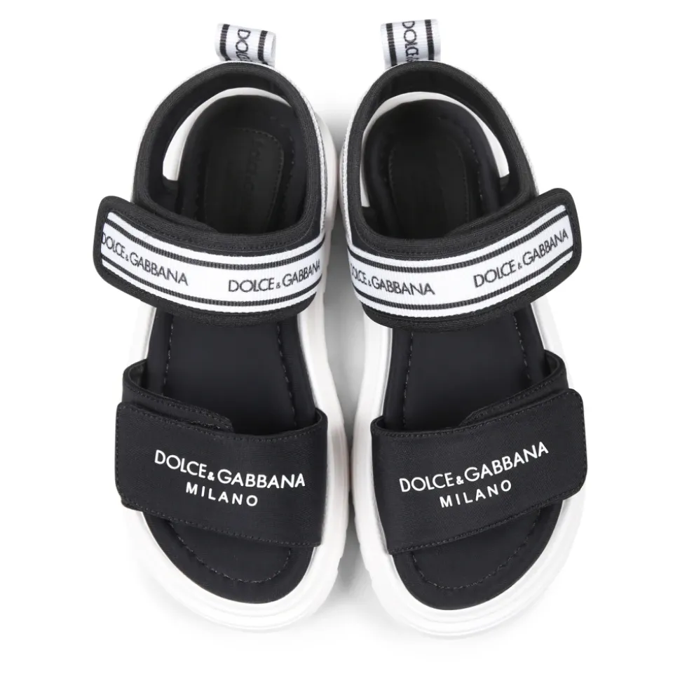 Ontdek deze stijlvolle zwarte sandalen voor kinderen van het luxe merk Dolce & Gabbana. Gemaakt in Italië, ze hebben een rubberen zool, klittenbandsluiting, logobanden op de bovenkant en een tong aan de achterkant. De voorkant is versierd met het logo van het merk. Gemaakt van 94% viscose, 5% polyamide en 1% elastaan.