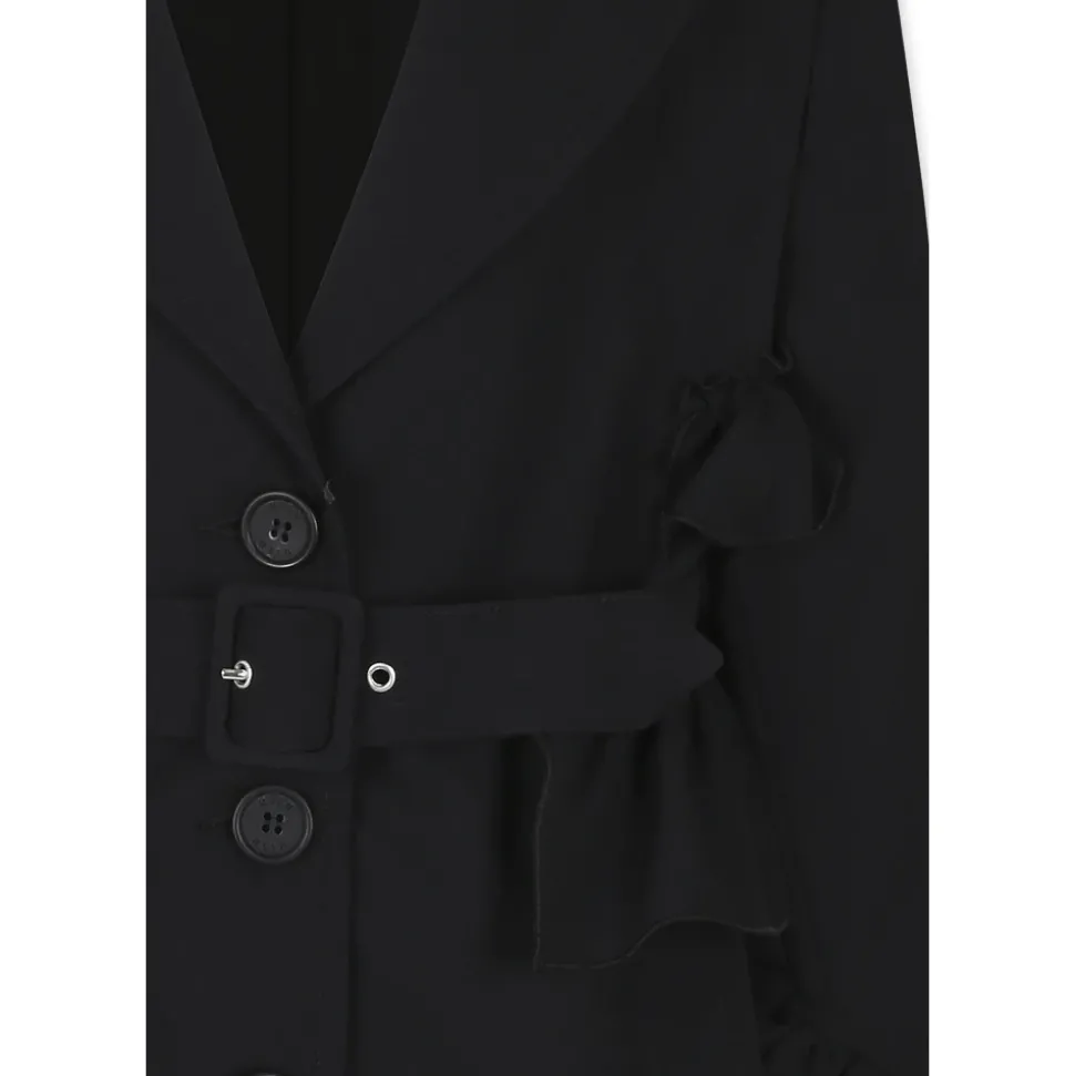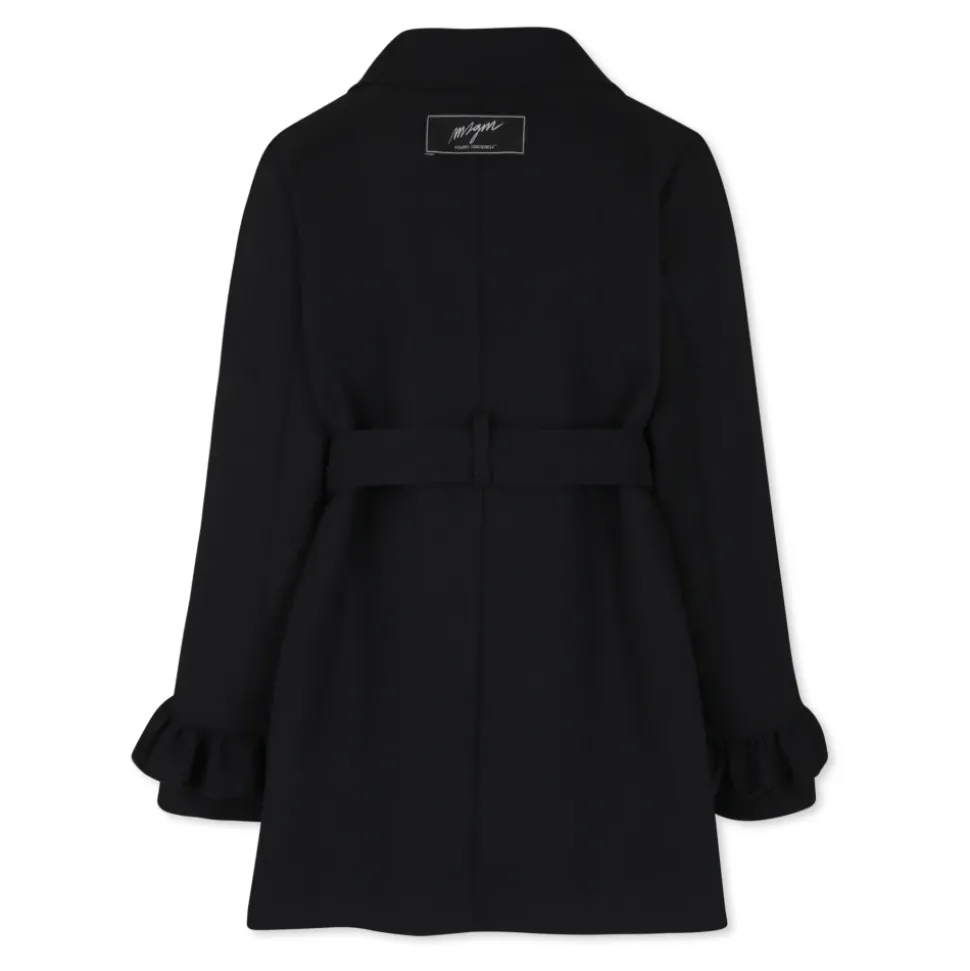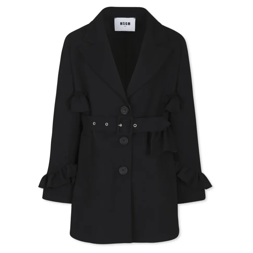 Upgrade de stijl van je kleintje met deze zwarte MSGM jas. Voorzien van lange mouwen, reverskraag, knoopsluiting aan de voorkant, zijzakken en ceintuurlussen. Versierd met ruches en logopatch op de achterkant. Gemaakt in Italië van 60% polyester, 37% viscose en 3% elastaan. Machinewasbaar op 30°C.
