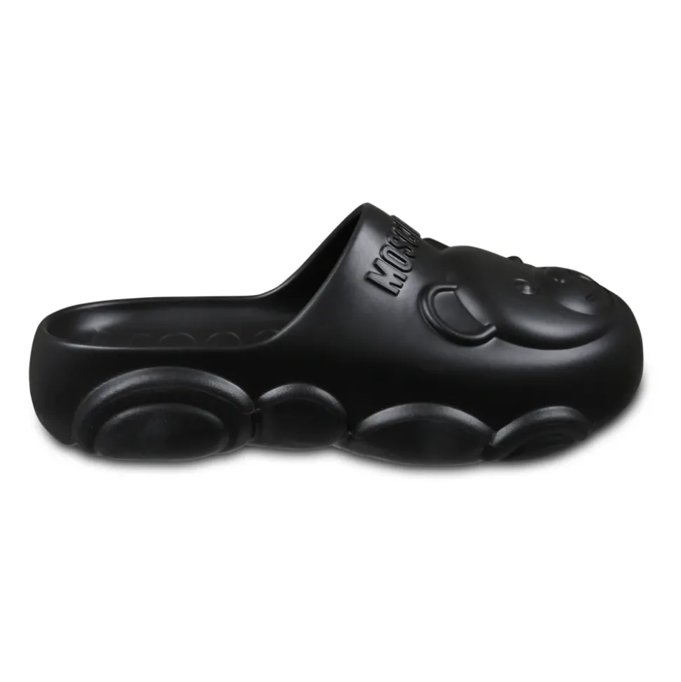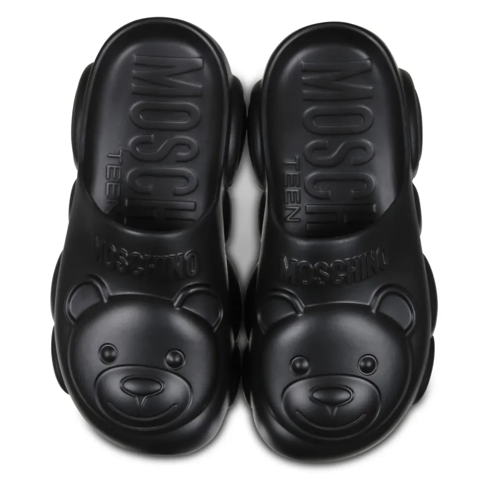 Upgrade de stijl van je kleine jongen met deze zwarte rubberen muilen van Moschino. Met een ronde neus en een zool in de vorm van een Teddybeer zijn deze sandalen versierd met een Teddybeer en een reliëflogo. Gemaakt in Italië van 100% ethyleenvinylacetaat.