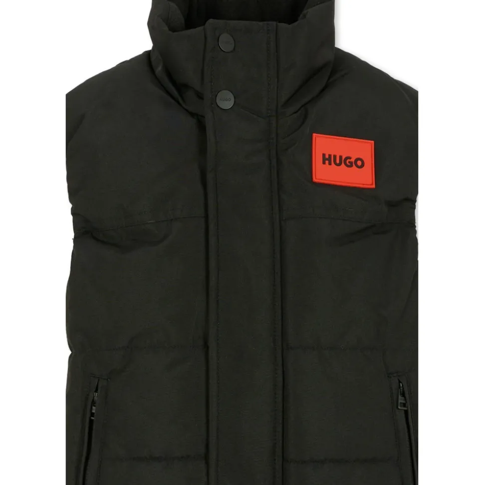 Blijf warm en stijlvol met deze zwarte waterdichte bodywarmer van Hugo. Licht gewatteerd en doorgestikt, met een hoge kraag, ritssluiting aan de voorkant, drukknoopsluiting en zijzakken met ritssluiting. Voorzien van een rood rubberen logo op de borst. Gemaakt van 100% polyester. Machinewasbaar op 30°C.